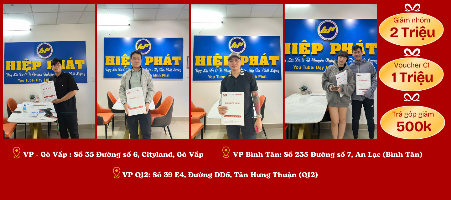 Bạn đang tìm kiếm một nơi đào tạo lái xe chất lượng, uy tín và hiệu quả. Trung tâm Giáo Dục Nghề Nghiệp Hiệp Phát chính là điểm đến lý tưởng cho bạn. Hiện tại Trung Tâm đang có hai văn phòng ghi danh nằm trên địa bàn Tp.HCM thuận tiện cho học viên tham khảo và cần nhân viên hỗ trợ tư vấn trực tiếp: CN1: Số 35 Đường số 6, KDC Cityland Land Gò Vấp, Tp.HCM., CN2 : Số 235 Đường số 7, Bình Trị Đông B, Bình Tân, Tp.HCM